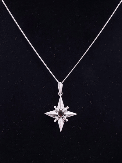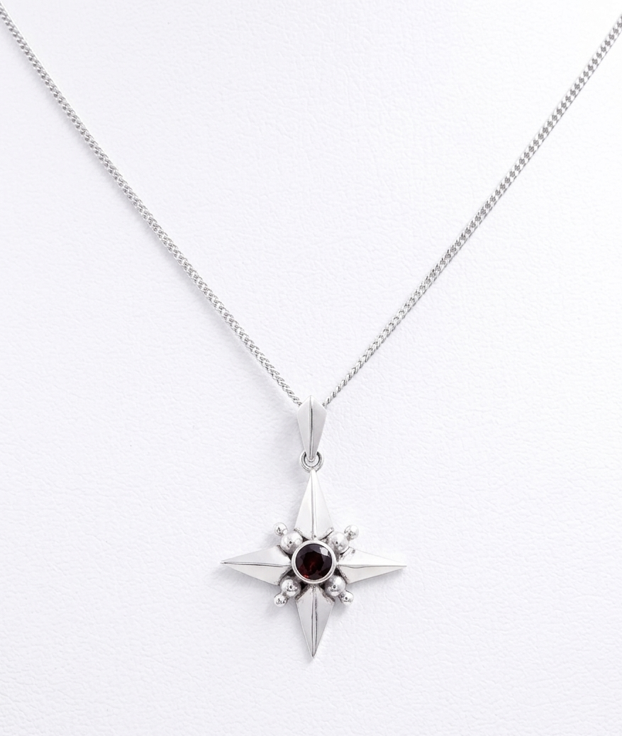 Minimalist Silver Compass Pendant with Round Cut Garnet Stone