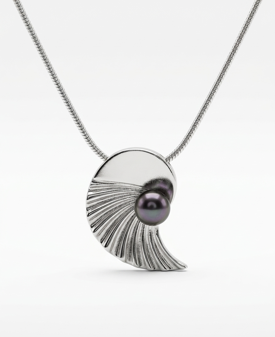 Ocean-Inspired Silver Pendant – Dark Round Pearl on Ribbed Shell Design